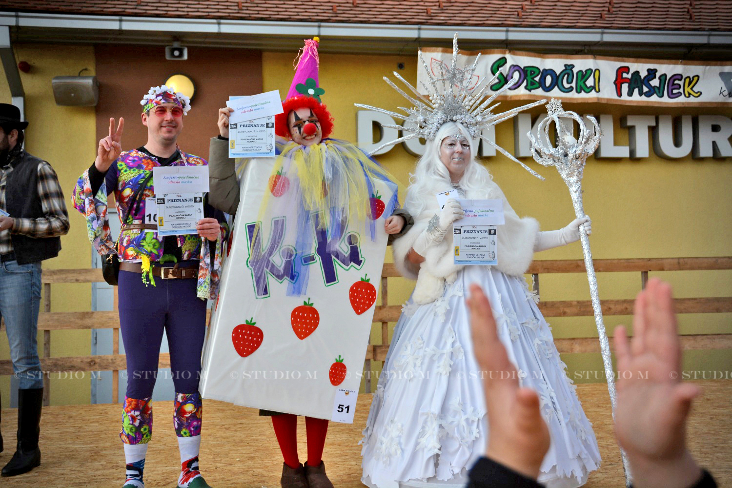 U kategoriji pojedinačnih maski – odrasli, prvo mjesto osvojila je Snježna kraljica, drugo mjesto pripalo je maski Kiki bombon, dok je treće mjesto osvojio Veseli hipi.